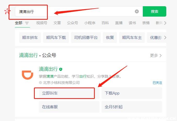 2、打开微信,搜索滴滴出行,选择公众号或小程序,进入注册或登录。