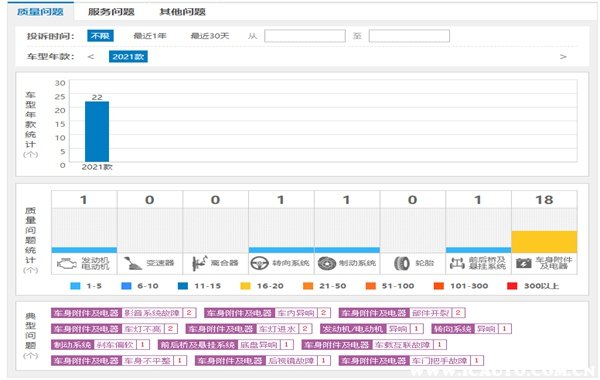 从车质网给出的数据可以看到,2021款的领克09目前仅仅收到了22条质量问题投诉,其中有多数都是集中在车身附件及电器上面。具体的质量问题表现为影音系统故障、车内异响、部件开裂、车灯不亮、车灯进水等,但都是数量较少的例子,所以领克09质量表现还是较好的。