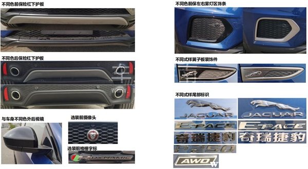 从申报图来看,新E-PACE的整体外观设计与已经停售的2018款没有太大区别,但在细节图上我们可以看到其提供了熏黑大灯、黑化窗条、黑车标、黑化轮毂等等个性化选装,估计是会提供一个更加运动的黑化版给消费者选择。