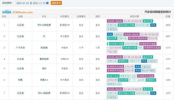 根据小编获取到的数据来看,在2023年1月1日至2023年11月15日这段时间里,比亚迪宋PLUS新能源收到的投诉量是排名第一,但这并不等同于故障率是第一。在下文中,让我们一同了解一下投诉的具体情况吧!
