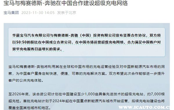 根据公告可知,到2026年底,华晨宝马和梅赛德斯-奔驰(中国)所成立的合资公司,将会在中国建设至少1000座超级充电站,总共7000个超充桩,第一批充电站将会在2024年开始,从中国重点新能源汽车城市进行试点运营,并在后续逐步拓展至其他地区城市。