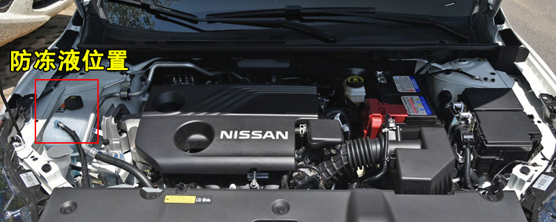 日产轩逸的防冻液储存罐位于发动机的左侧,如图所示。防冻液更换周期为6万公里,更换容量为7L。