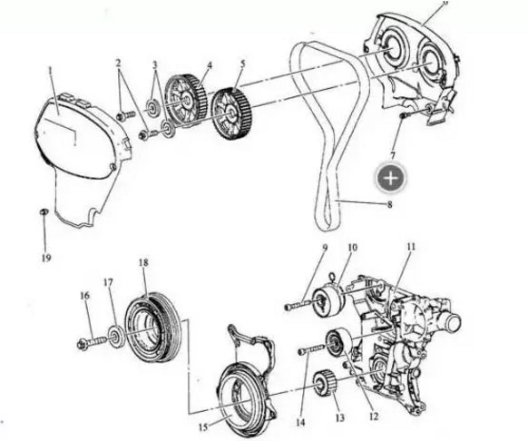 - 拆掉正时涨紧轮,正时惰轮和正时皮带。安装时要求正时齿轮的记号跟3相同。