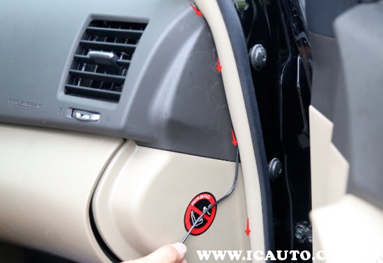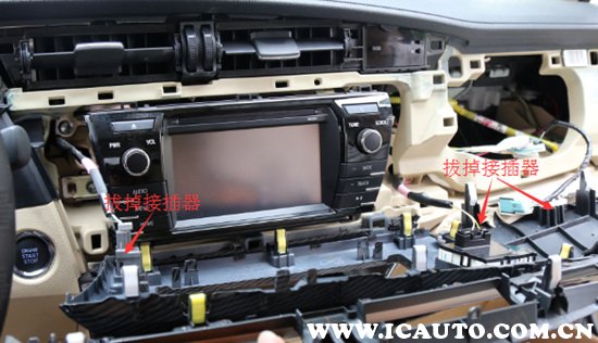 1、用撬棒撬开副驾驶座侧的装饰面板上方和面板下方,然后用撬棒撬开中控周边的装饰面板。取出装饰面板,拔掉下图箭头所示各个接插器