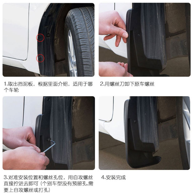 需要注意的是:如果增加安装扰流板、车轮装饰板等,必须保证不影响流向前制动器的空气流,否则制动器会过热。挡泥板安装方法如下。