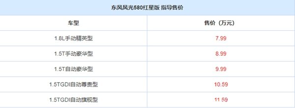 | 全新一代风光580 指导售价 | |