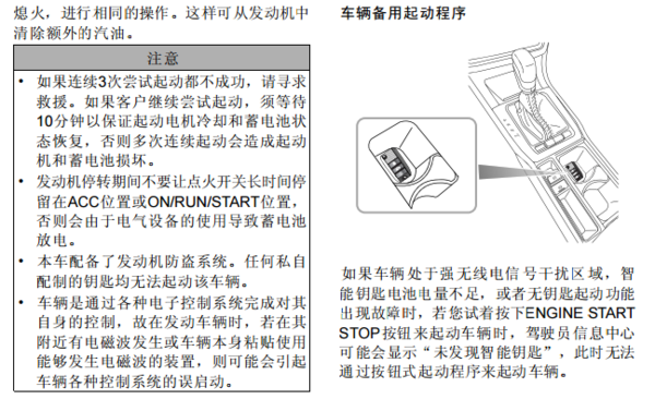 起动程序1关闭所有不必要的电器设备(包括空调);2拉起驻车制动(参见本章节的“制动系统”);3确保换挡杆置于P或N挡;说明:当换挡杆处于任何其他位置时,发动机均无法起动。4踩下制动踏板;5按下仪表板上的ENGINESTARTSTOP按钮,在发动机开始起动时,松开按钮。说明:如果发动机不能运转起来(即使一直按住起动按钮,15秒后起动操作亦将被中止以免损坏起动机),再次按下ENGINESTARTSTOP按钮,可使点火开关回到ON状态中止发动机起动操作。如需重新起动发动机,需在不踩下制动踏板的情况下,再次按下ENGINESTARTSTOP按钮,将点火开关恢复到OFF位置后再进行起动操作。发动机暖机后怠速转速会下降。起动发动机后不要立即提高发动机转速。逐渐操作发动机和变速器,以便使机油能够预热和润滑所有工作部件。如果智能钥匙不在车内或受到某些干扰,驾驶员信息中心会显示未发现智能钥匙的提示。如果遥控钥匙内的电池需要更换,驾驶员信息中心会显示更换遥控钥匙电池的提示,车辆仍然可以驾驶。如果发动机在5-10秒后不能够起动,尤其是在寒冷天气下(在-10°C以下),有可能是涌入过量汽油。尝试将加速踏板踩到底,并保持住,同时按下ENGINESTARTSTOP按钮,最多15秒钟。每次起动之间应间隔至少10秒钟,让起动机冷却。发动机起动后,松开按钮及加速踏板。如果车辆短暂着火后又熄火,进行相同的操作。这样可从发动机中清除额外的汽油。