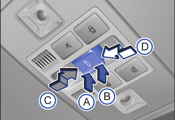 水平向后按压按钮C至1挡位置;按压按钮至2挡位置将天窗打开至舒适位置。