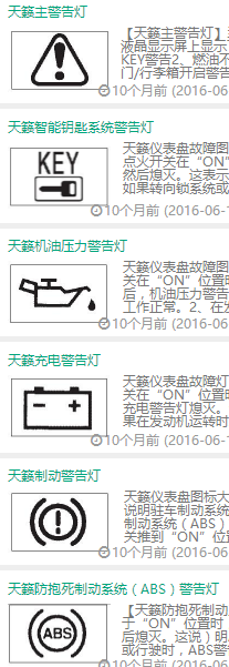 随着科技的进步,越来越多部件安装到汽车上,继而在仪表盘上出现各种各样的图标,日产天籁也不例外。图标种类繁多,反馈给人们的信息也大不相同,为此更使得车主们要认真记住图标反馈出的信息。数目如此繁多也给新车主带来一定的困扰。下面就为不懂的车主提供一点小帮助。看看这些图标是什么来着