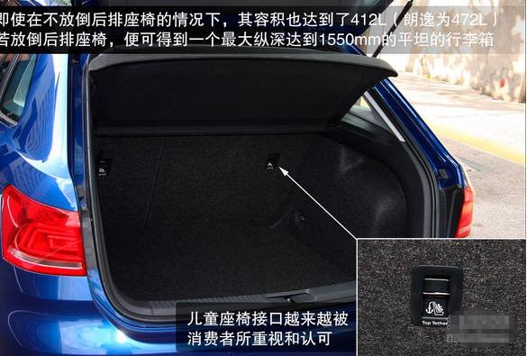 汽大众朗行得益于掀背式造型,朗行的行李箱不论是空间还是开口角度都很有优势,即使在不放倒后排座椅的情况下,其空间容积也达到了412L(朗逸为472L)。若放倒后排座椅,便可得到一个最大纵深达到1550mm的平坦的行李箱,充分体现了两厢车的优势。