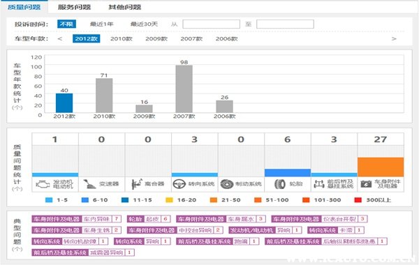 首先就是马自达3质量方面的通病,从车质网给出的数据我们就可以知道,主要有以下这些(以质量问题投诉量多一些的年款车型为主):