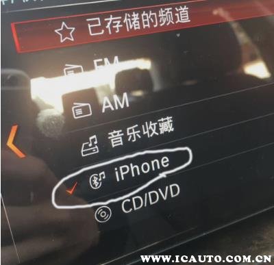 2. 进入后点我们可以发现这个菜单是控制车内多媒体播放源的,我们可以在这里设置包括手机蓝牙,电台和CD。在这里我们需要点击的是“iphone”选项。