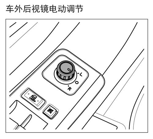 1. 转动后视镜调节旋钮至“L”或“R” 位置(“L”代表左则 ;“R”代表 右侧)。