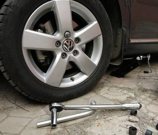 1、车辆一定要放在平坦的路面,如果在道路上,需要在后方放置安全指示牌。轮胎的螺母用专用工具拆卸下来,松螺母的时候对角松。