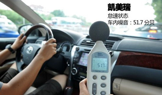 丰田凯美瑞提到噪音抑制水平,光靠耳朵听不靠谱,来测试一下车厢内噪音值。我们把两台车停在北京四环辅路边,测得当时车外环境噪音大约为78.1分贝。保持怠速状态、车门窗全部关闭,凯美瑞车厢内噪音为51.7分贝,天籁车厢内噪音为47.4分贝。这个小试验表明相同条件下,天籁车厢内隔音效果比凯美瑞更好。