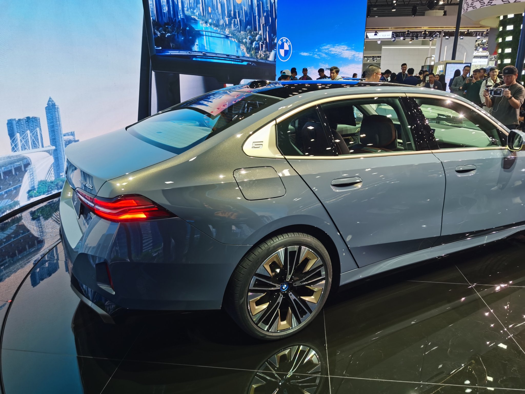 全新宝马i5的外观造型与宝马5系相近,但分别在中网、车窗框架处使用香槟金色饰条进行点缀,并且采用了不一样的前保险杠,继而与宝马5系区分开来。C柱的霍氏弯角饰板上同样有数字“5”浮雕,可在充电过程中提供呼吸闪烁效果,尾灯同样变得细长,但样式也与宝马5系不同。