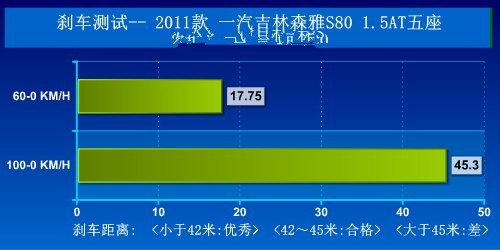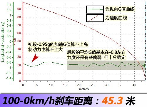 森雅R7的几次的制动测试成绩都在45米左右徘徊,而最终成绩被定格在了45.3米,只能算是差。影响制动效果的因素有很多,比如制动力、车重、轮胎宽度、花纹、地面材质、温度、重心转移等等。通过上面的曲线和数据我们能够发现这台森雅S80的制动力算不上强劲;通过查询配置也能看出制动器为前盘后鼓;四条轮胎宽度为185。我们并不好判断究竟是哪一项决定了这样的制动成绩,只能说它们多多少少都会产生一些不利影响。下面我们来看一下测试: