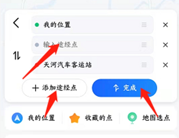 3、输入途经点的名称并点击添加,最多可添加三个途经点。添加完成后,点击完成。