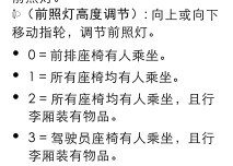 威朗大灯高度调节的建议为:0前排有人乘坐,1所有座椅都有人乘坐,2所有座椅都有人乘坐后备箱满载,3驾驶员座椅有人乘坐,且行李箱有物品时。