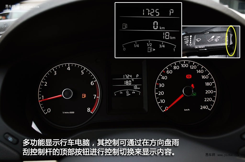 速腾行车电脑显示在仪表盘中央,设置方法如下,最上方的是时间,第二行目前显示的信息是车内的温度,温度显示下方表示的是车的总里程及所剩油量。当我们在行进过程中需要查看其它数据的时候,就需要对仪表盘进行调节,这时可以看到方向盘右方有个调节手柄。我们找到调节手柄的顶端,可以看到一个按钮,上下按动就能调节矩形框内显示的内容了。