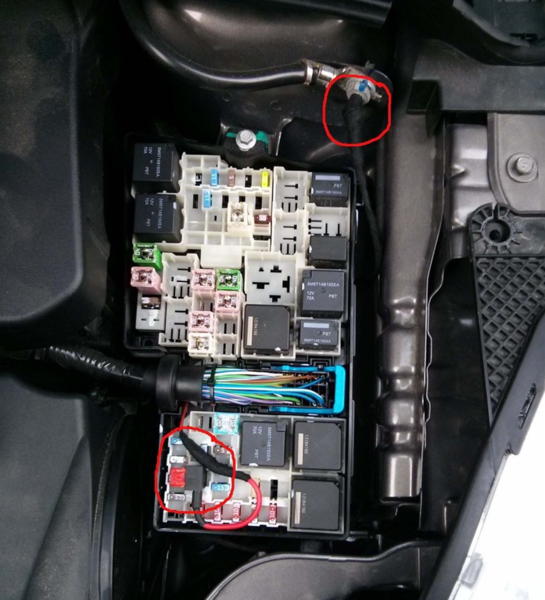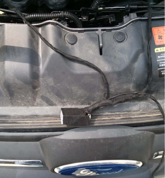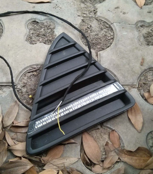 该日间行车灯安装于进气格栅两旁的獠牙位置。首先需在獠牙部件上打孔穿线,把日间行车灯安装上去,再把线路用胶布缠好。该日行灯在大灯插头处取电,如需实现日间行车灯兼转向灯功能的需与转向灯控制线路接好。需要注意,所有线头和露在外面的线都要用电工胶布缠好,以免磨损造成短路起火。日间行车灯的控制器要在适当位置放好,避免行驶时随车乱动造成隐患。从保险丝盒里搭线取电,正极接F27,负极接蓄电池负极。最好装上獠牙,测试灯光。