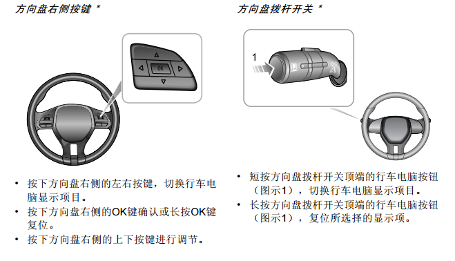 行车电脑包括以下信息: • 数字车速:显示当前车辆行驶速度。 • 瞬时油耗:显示当前发动机工作时的油 耗。 • 续驶里程:该功能自动计算并显示在油箱 用空之前车辆还能行驶的里程,重新加油 后该里程数会相应变化。 • 自启动后:显示自启动后的持续时间、平 均车速、平均油耗和距离值。车辆下电一 小时后,这些数值会被复位。也可通过长 按多功能方向盘右侧的OK键复位。• 自复位后:显示自上一次复位后的持续时 间、平均车速、平均油耗和距离值。可通 过长按多功能方向盘右侧的OK键复位。