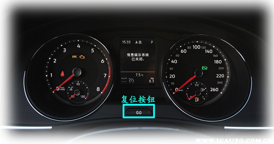 2. 按住仪表盘上的“0.0”(复位)按钮,按钮位置如上图所示。