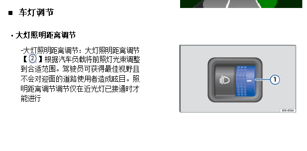 灯高度可调就是说前大灯有调节灯光照射角度的功能,通过调节大灯照射角度以便获得最佳的照射范围,从而提高道路行驶的安全性。大灯高度可调一般在汽车的内部有手动调节旋钮,可以随意调节前照灯的照射高度。
