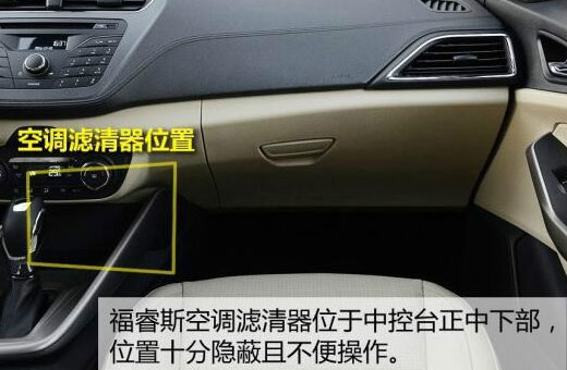 福特福睿斯空调滤芯更换:福睿斯空调滤芯位于副驾一侧中控台下方里面,位置如下图所示,将其盖板拆卸之后就可以看见空调滤芯了,盖板为长型条状,卸下盖板之后就可以将空调滤芯取出。安装时需要注意方向,空调滤芯上有方向标注。