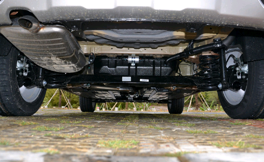 宝骏510的前悬挂也是采用常见的麦弗逊结构。无论是从结构、布局,还是用料上,宝骏510的前悬挂都与同价位的车没有太大的出入。前副车架也是采用传统的“元宝梁”形式。虽然“C”字形和“口”字形的副车架在结构上更优,但相对来说成本也会更高。在细节上,宝骏510在前轮拱下方设计有扰流板,主要的目的是减少轮胎乱流的产生,起到降噪的作用。这种设计在通用车型上是很普遍的。另外宝骏510前悬挂采用的是与下控制臂一体式的球头,相对分体式球头来说,更换成本会稍高一些。除此之外,宝骏510在下摆臂与车身的连接处也加入了橡胶衬垫来提高高级感。至于副车架与车身的连接点都是硬性连接。在底盘下方用上了两块大面积的塑料板进行覆盖,这在同价位的车型来说确实很少见。这种做法最大的作用就是能减少底盘的乱流,能起到一定降噪和提高车辆稳定性的作用。当然也能对底盘起到一定的防护作用。