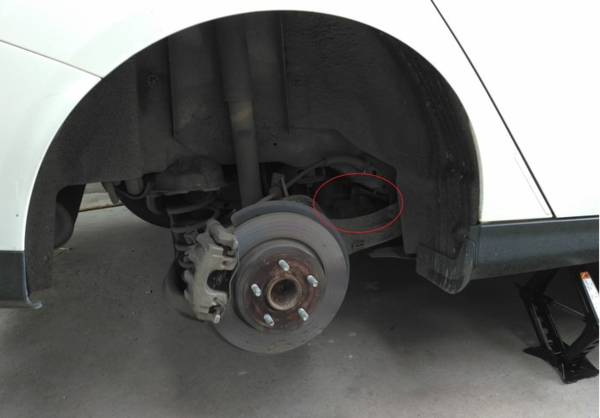 汽油滤清器位置如图,于右后轮胎后面,更换滤清器需拆掉轮胎。