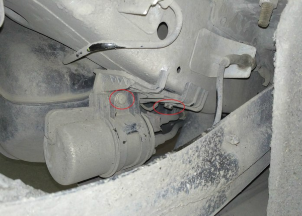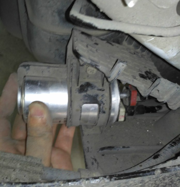 以下就是汽油滤清器了,图中红圈的两个地方就是要拆的螺丝。工具:10mm套筒+十字螺丝刀。