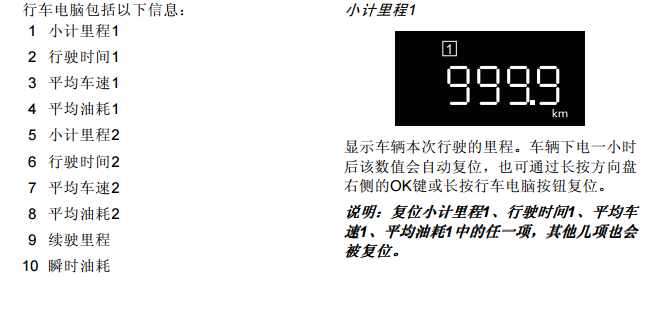 行车电脑包括以下信息: • 数字车速:显示当前车辆行驶速度。 • 瞬时油耗:显示当前发动机工作时的油 耗。 • 续驶里程:该功能自动计算并显示在油箱 用空之前车辆还能行驶的里程,重新加油 后该里程数会相应变化。 • 自启动后:显示自启动后的持续时间、平 均车速、平均油耗和距离值。车辆下电一 小时后,这些数值会被复位。也可通过长 按多功能方向盘右侧的OK键复位。• 自复位后:显示自上一次复位后的持续时 间、平均车速、平均油耗和距离值。可通 过长按多功能方向盘右侧的OK键复位。
