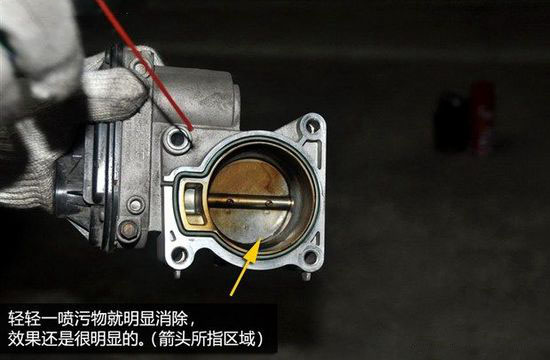 轻轻一喷节气门内就干净了很多,这里建议清洗时最好对着垃圾桶,因为喷射的同时积碳会被液化流下,容易弄脏环境。并且清洗剂有一定的刺激性气味,所以操作时最好戴上口罩,远离口、鼻、眼睛。