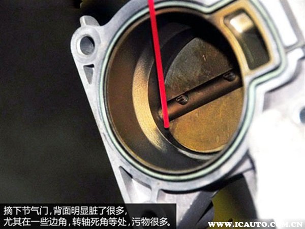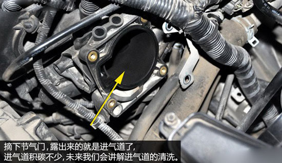 4个螺丝拆除后,就可以摘下节气门了,此时露出的管道就是进气道了。从下图中不难看出,我们这台演示车进气道明显有很多黑色的积碳,不过关于它的清洗我们未来会介绍。这里我们提醒一句,拆下节气门后最好用报纸等物体盖住进气道的入口,防止有杂物进入。