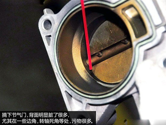 摘下节气门以后观察就方便很多了,我们转到背面来看,节气门内部的污物还是很多的,尤其是边角,转轴附近的位置都是藏污纳垢的死角,若不拆除很难彻底清除干净,所以大家若在专业店清理一定要要求工作人员拆除后清洗。