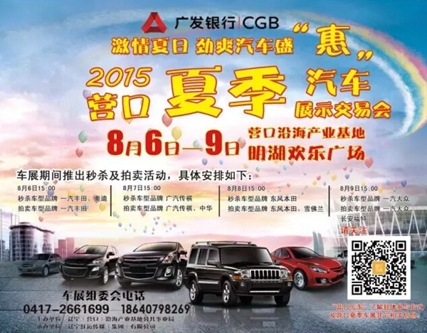 【营口车展】激情夏日,劲爽汽车盛“惠”,广发银行2015营口夏季车展于8月6日—8月9日明湖广场盛大启幕!30余家主力品牌联合奉献钜惠狂潮!车展期间特推出秒杀活动和拍卖活动。