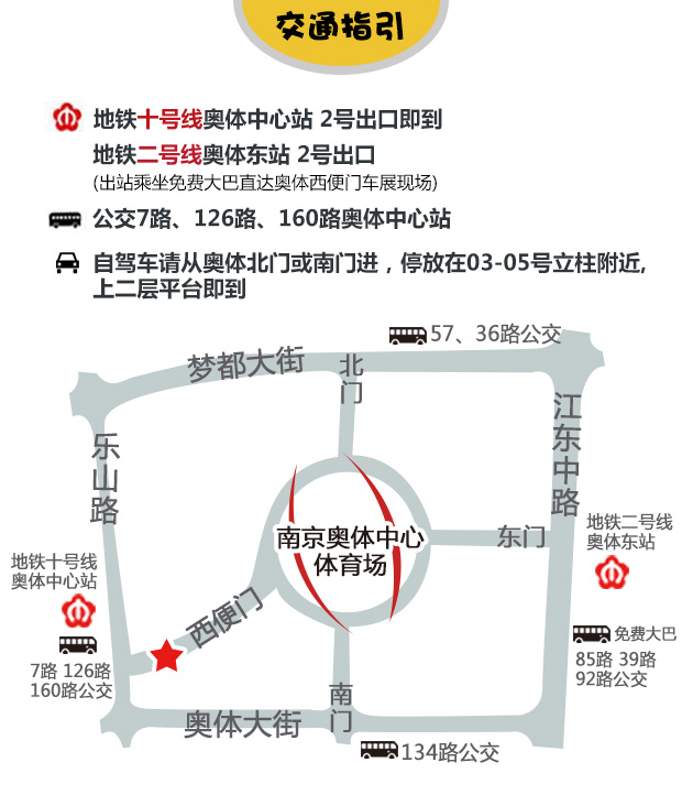 答:建议乘坐地铁十号线至奥体中心站 2号出口 出站即达车展现场,地铁二号线奥体东站,出站可乘坐车展免费往返接待车至奥体西便门 ,公交线路:7路、126路、160路公交线路奥体中心站下均可到达。自驾车前往车展的网友可以从奥体中心北门进入,停放在03-05号立柱的附近,由楼梯上二层平台向西即到。