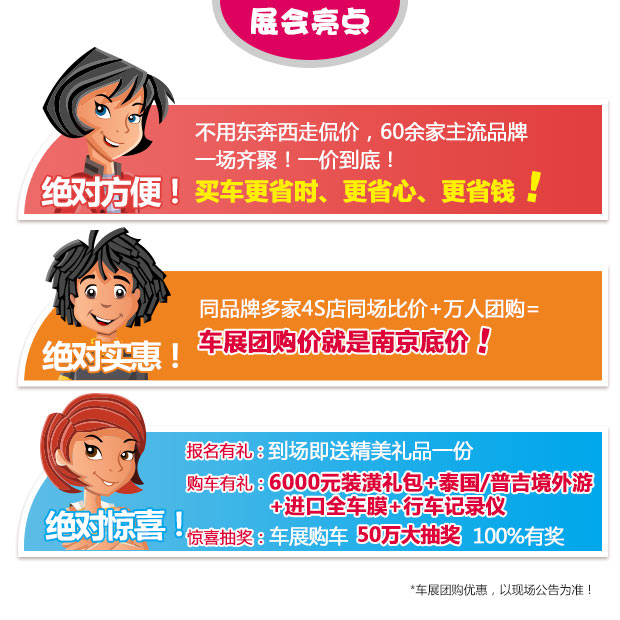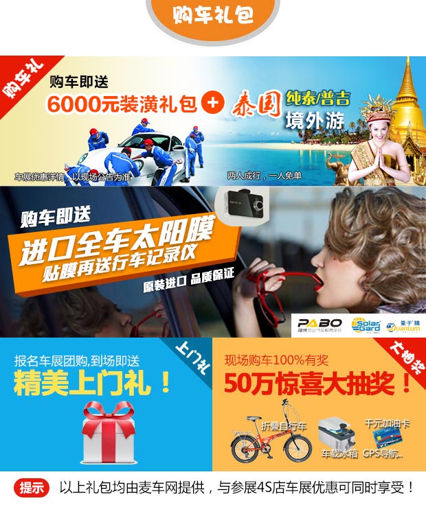 优惠政策:万人团购最低价!车展买车就送6000元装潢礼包+纯泰/普吉境外游+进口全车膜+行车记录仪+50万惊喜大抽奖100%有奖!