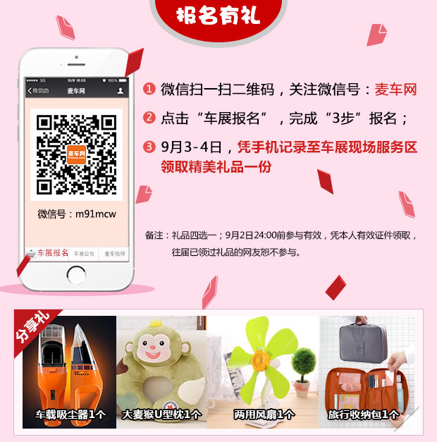 答:除了4S店的购车优惠,麦车网提供了价值五十万“购车惊喜大抽奖”,现场购车100%中奖!现场凭购车合同、订金收据即可至服务区领取。本活动杜绝一切虚假行为,活动结束后将进行中奖名单公示,敬请关注!