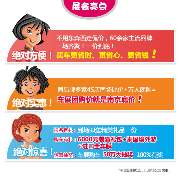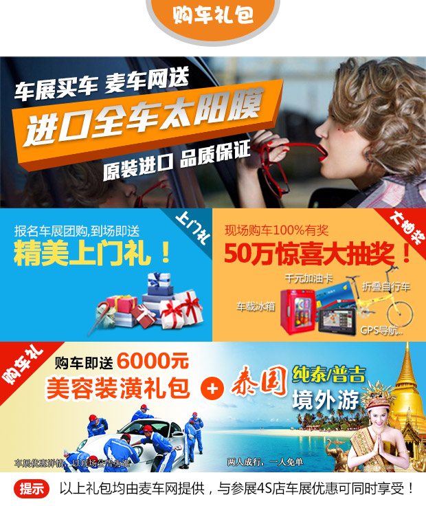 优惠政策:万人团购最低价!车展买车就送6000元装潢礼包+泰国境外游+进口全车膜+行车记录仪+50万惊喜大抽奖100%有奖!