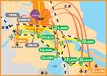 距南京禄口国际机场仅1.5小时,上海虹桥机场2.5小时,距离扬泰机场0.5小时,可直达东京、香港、芝加哥、汉城、新加波、阿姆斯特丹等城市。