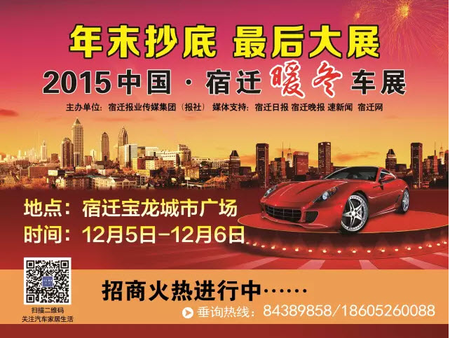 【宿迁车展】[敬告]据相关管理部门要求,原定于2015年11月21~22日在宝龙城市广场举办的2015中国·宿迁暖冬车展因城市创建要求延期至2015年12月5~6日举办。给大家带来不便,敬请谅解!