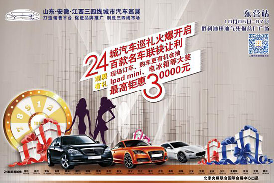 【东营车展】10月6日-7日在山东、安徽、江西三四线城市汽车巡展东营站现场购车,不仅能享有厂家给出的最低折扣价格,还有更多福利等您享,节能补贴、0利率购车、砸金蛋赢现金、千元加油卡和内饰大礼包等。除此之外,还能参与每天的购车抽奖活动,赢取ipad mini、电冰箱、自行车、太空被和食用油等贴心大奖。巡展买车品牌多、车型全、价格低、赠品多、优惠大。10月6日-7日,几十款热销车型国庆集体大放“价”最后一次机会,下手别太晚。