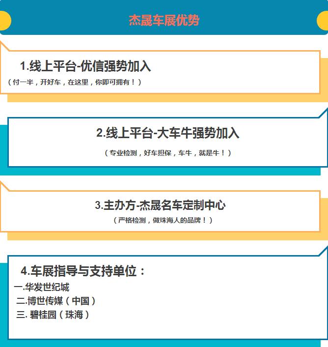 杰晟名车随时代发展,在别出一格的创新模式,打造出最具品味价值的汽车定制中心,就本次思想,建立在珠海区域区别于传统的车展,打造一个以二手车、稀缺新型车为 主导的汽车展销会,定位于珠海首场专业新旧二手车展,以参展车商强强联合、以第三方平台见证质量、实现付一半开好车的展销会理念,让珠海都市人群提供专业、安全、经济的汽车展销会,让更多的人拥有心目中的车型,解决购车难、担惊受怕的心情,促进珠海区域汽车发展新起点。打造圈层助力营销,带动珠海区域车行新业态的经济效益发展。