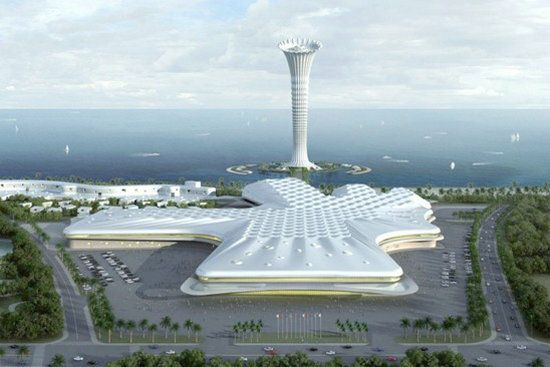 海南国际会议展览中心由深圳天利地产集团投资兴建,由2008年奥运会“鸟巢”设计师——中国建筑设计研究院李兴钢先生执掌设计。总建筑面积13.62万平方米,总投资人民币13.8亿元,由一个展览中心和一个会议中心组成,其中展览中心建筑面积7.7万平方米,会议中心建筑面积4.2万平方米。整体建筑外观造型新颖、独特,充分体现了热带滨海元素,屋顶呈波浪型,规则韵律、连绵起伏。它有一个能容纳2000人的开幕式主会场,设有6个展览大厅,共有标准展位2300个;会议中心面积3.5万多平方米,包括一个容纳2000人的多功能厅,一个容纳2000多人的剧场式会议厅,一个容纳700人具备同声传译系统的国际会议厅,还有18个贵宾接待厅等设施。