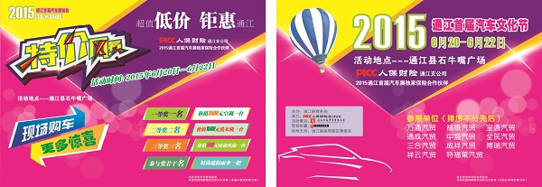 为了展示汽车工业的最新科技成果、树立环保理念、传播汽车文化、活跃汽车市场、满足人们的购车需求,普及人们的交通安全法律、法规,车辆保险知识,带动高明新区石牛广场超市及周边消费,我公司拟准备和我县境内11家车辆销售商在通江县高明新区石牛嘴广场举办“通江县首届汽车文化节”及交通法规、车辆保险宣传活动。本届通江汽车文化节以“人·车·生活”为主题,全力打造汽车文化节品牌,拉动汽车经济,为参展商、消费者、市场搭建诚信交易的平台。本次通江汽车文化节丰厚礼品,惊喜不断!