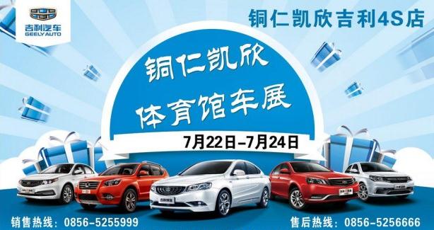 【铜仁车展】盛夏钜惠年中巨献,2016年7月22日铜仁体育馆国际车展将再次撼动绿城,一场车展界的饕餮盛宴将拉开序幕!铜仁体育馆车展7月22日开幕,展会为期3天:7月22日-7月24日,近几十个参展品牌,涵盖豪华车进口车合资车热销车各个领域,多款梦幻座驾,百闻不如一见的豪车,梦寐以求的爱车,经济适用的代步车,应有尽有! 铜仁凯欣吉利4S店将以最优惠的价格为市民提供最优质的购车展会服务。