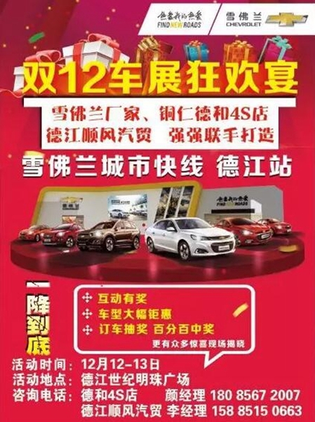 【铜仁车展】双11已过,双12即将来临,在这个寒冷的冬日里,你还忍心你的家人在凛冽寒风中奔走街头吗?雪佛兰城市快线-德江站,举办双12车展狂欢宴,雪佛兰厂家、铜仁德和4S店、德江顺风汽贸强强连手打造!到场有礼,互动有礼,订车抽奖,车型现金大幅钜惠!一降到底!