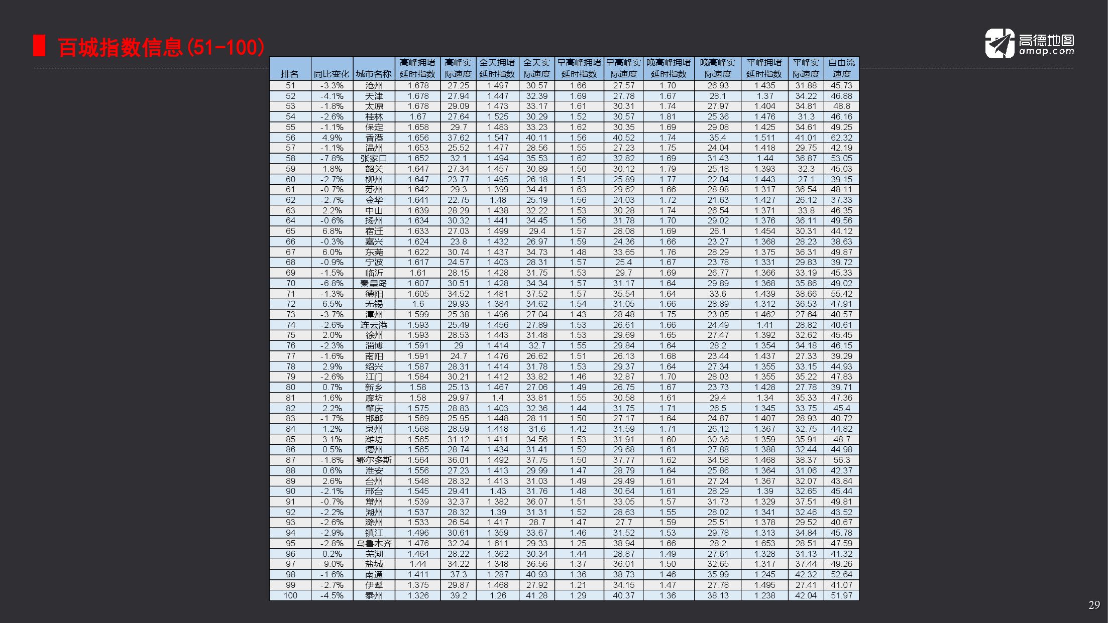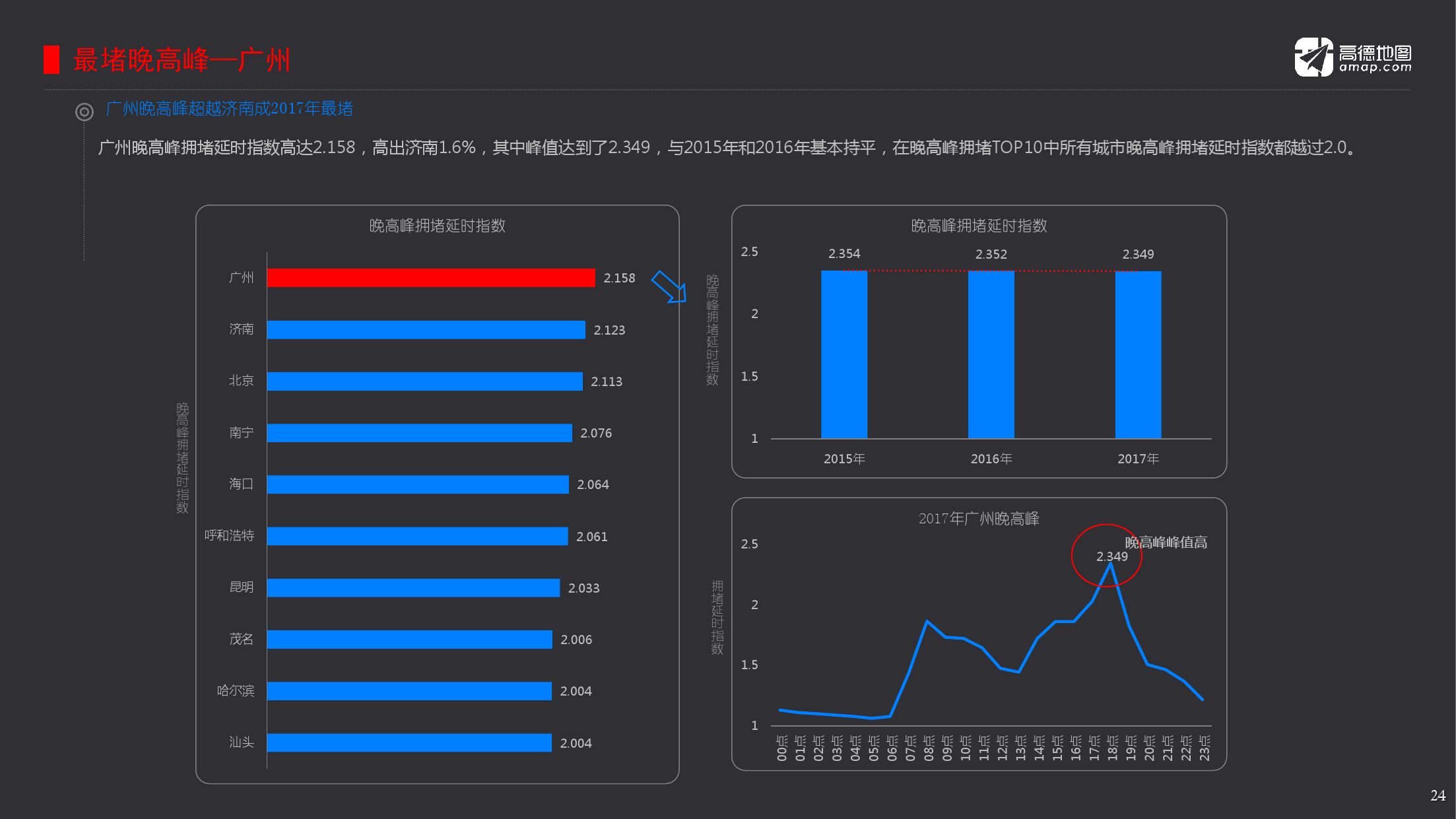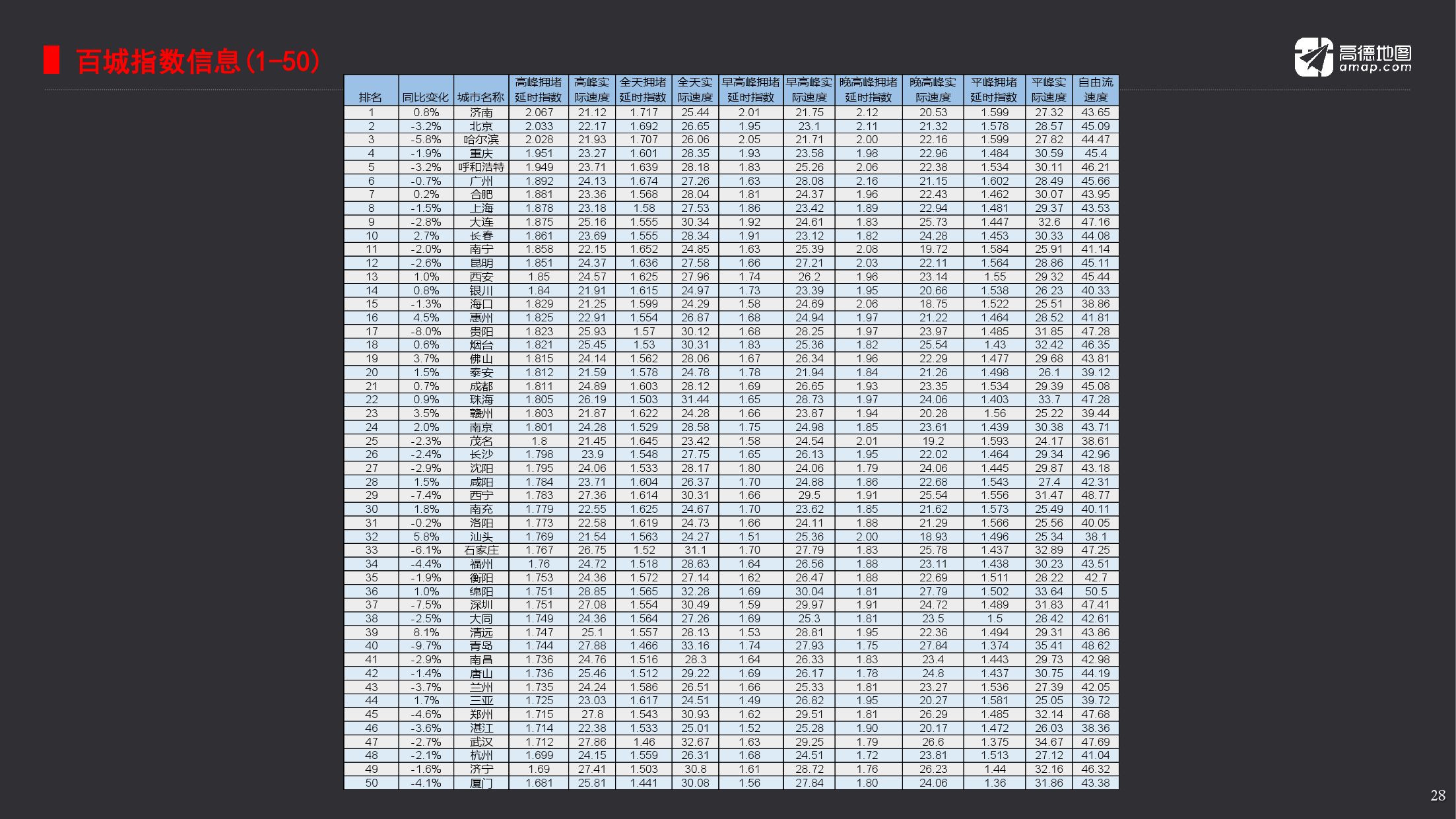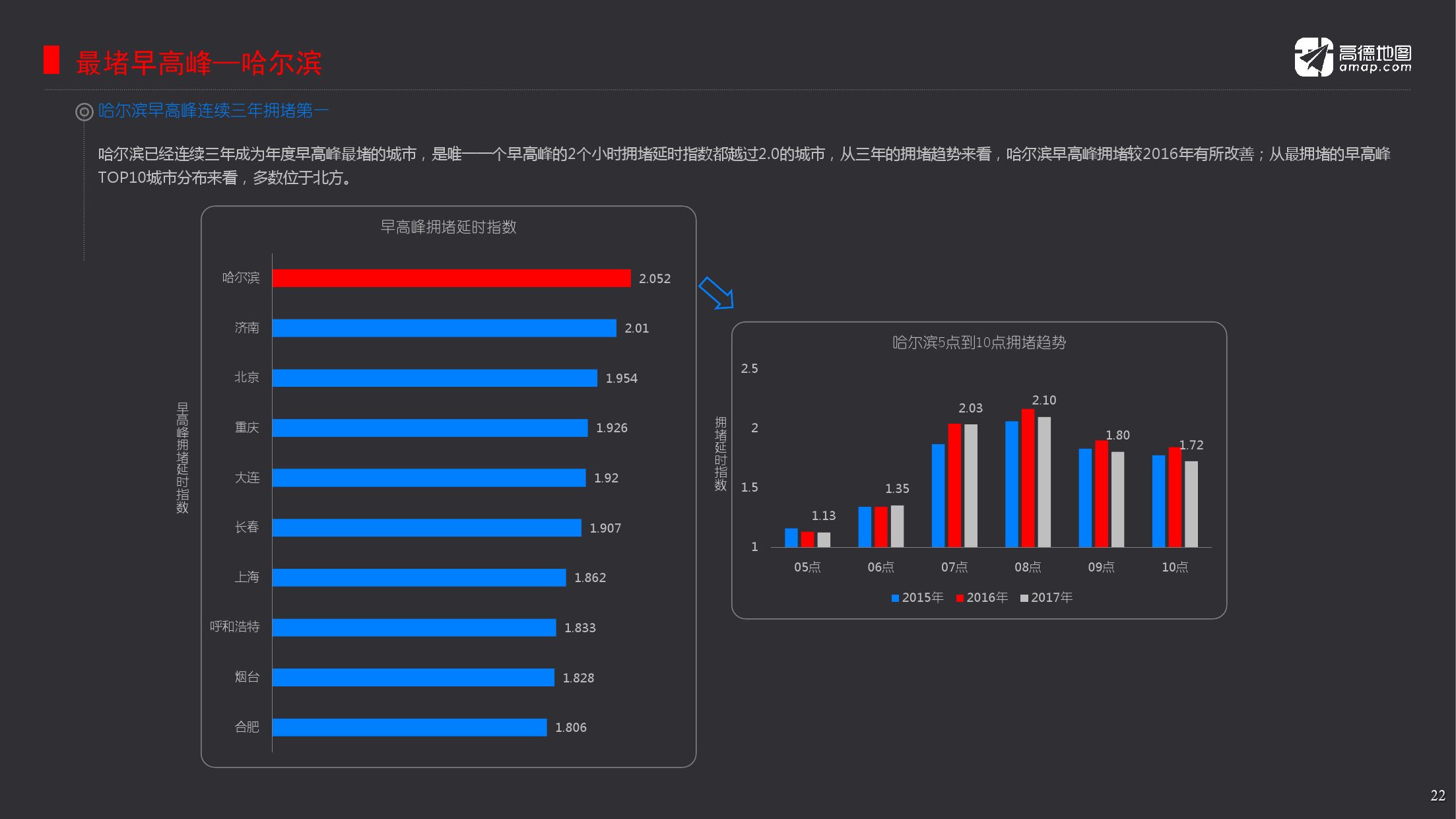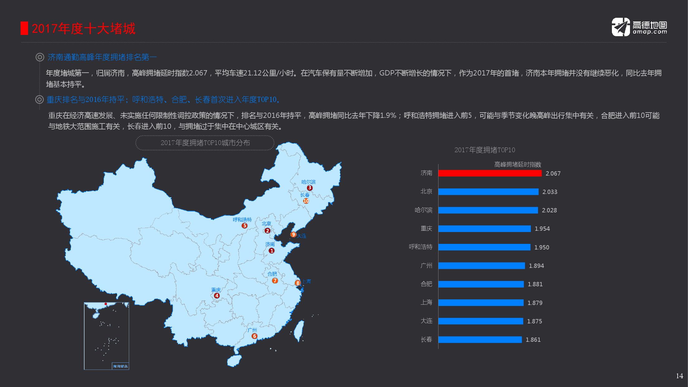 2017年度十大堵城,分别为济南、北京、哈尔滨、重庆、呼和浩特、广州、合肥、上海、大连与长春。年度首堵归属济南,城市平均车速为21.12公里每小时。